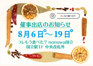 下記の日程にて、JR国立駅1F 中央改札外『コレもう食べた?』 に出店いたします。