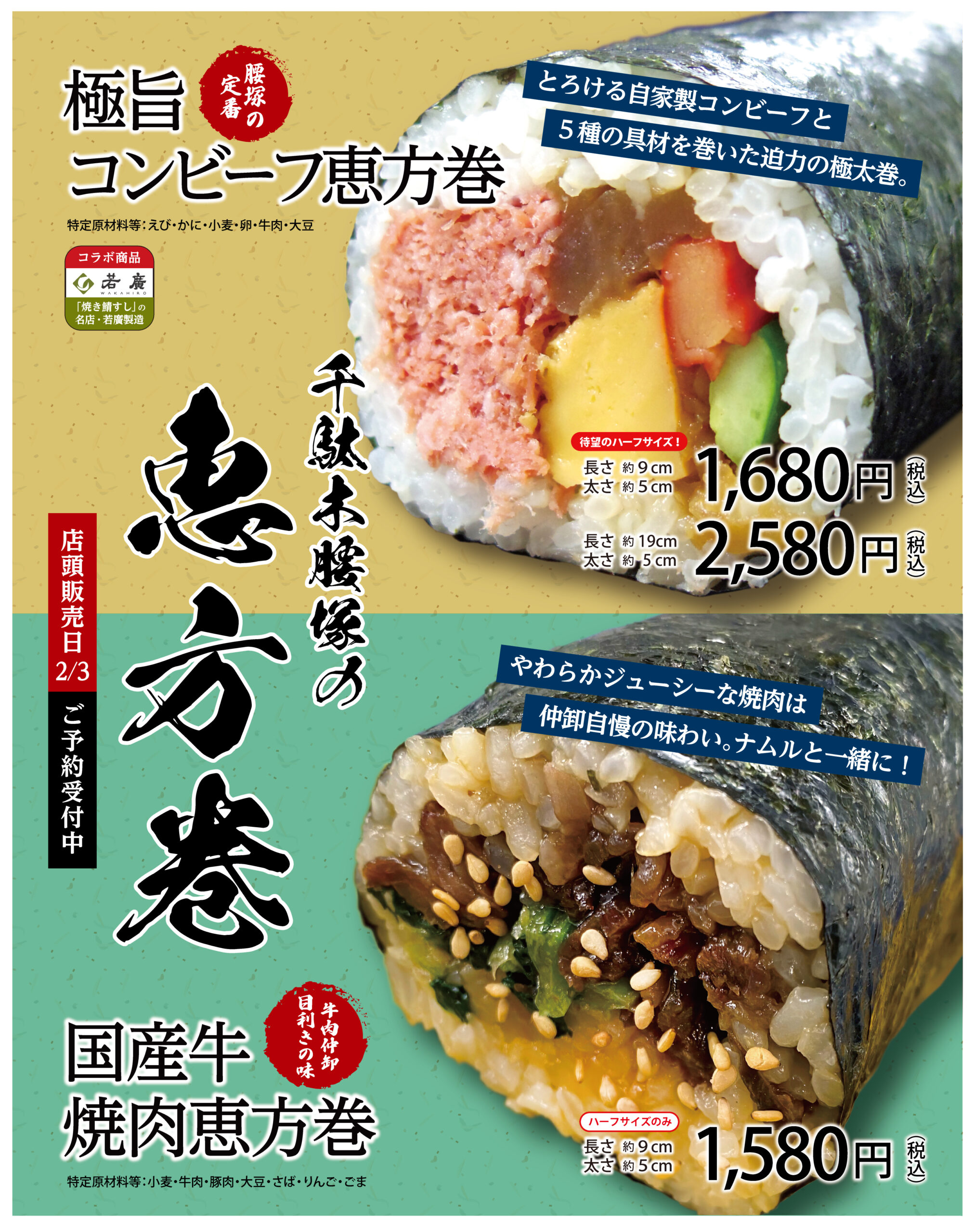 精肉専門店ならではの厳選素材を使用した極太恵方巻で大きな福を巻き込みましょう。