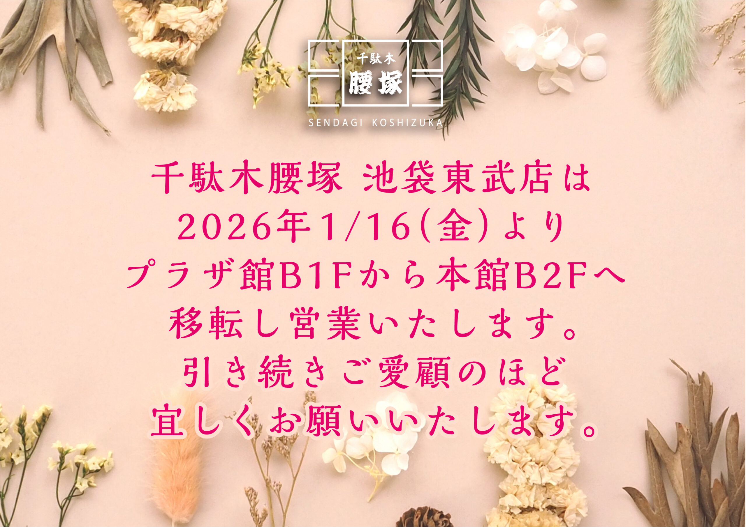 千駄木腰塚 東武池袋店は 2026年1/16(金)より本館B2Fへ移転し、引き続き営業いたします。