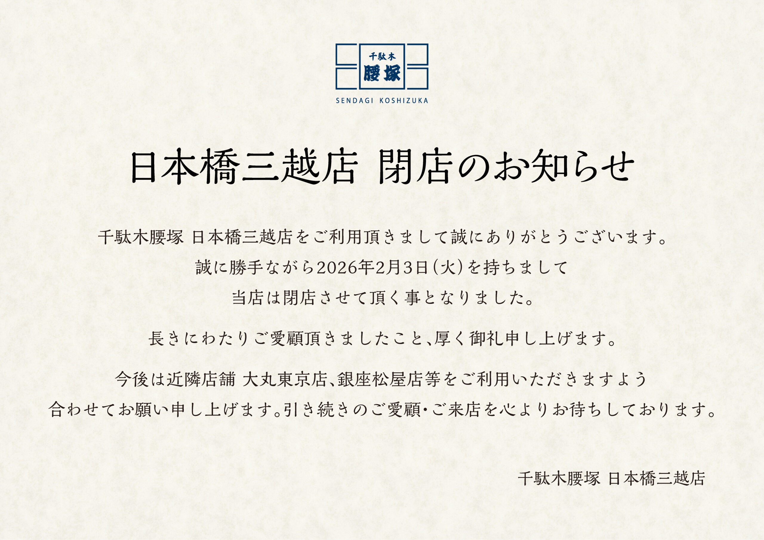 千駄木腰塚 日本橋三越店は2026年2月3日(火)をもちまして閉店いたします。 長年のご愛顧に心より御礼申し上げます。 今後は近隣店舗の大丸東京店・銀座松屋店等をご利用いただきますようお願い申し上げます。